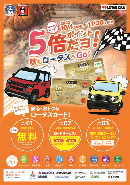 バッテリー交換・タイヤ購入・オイル交換など、ロータス店でのお支払いはロータスカードがダンゼンお得です!